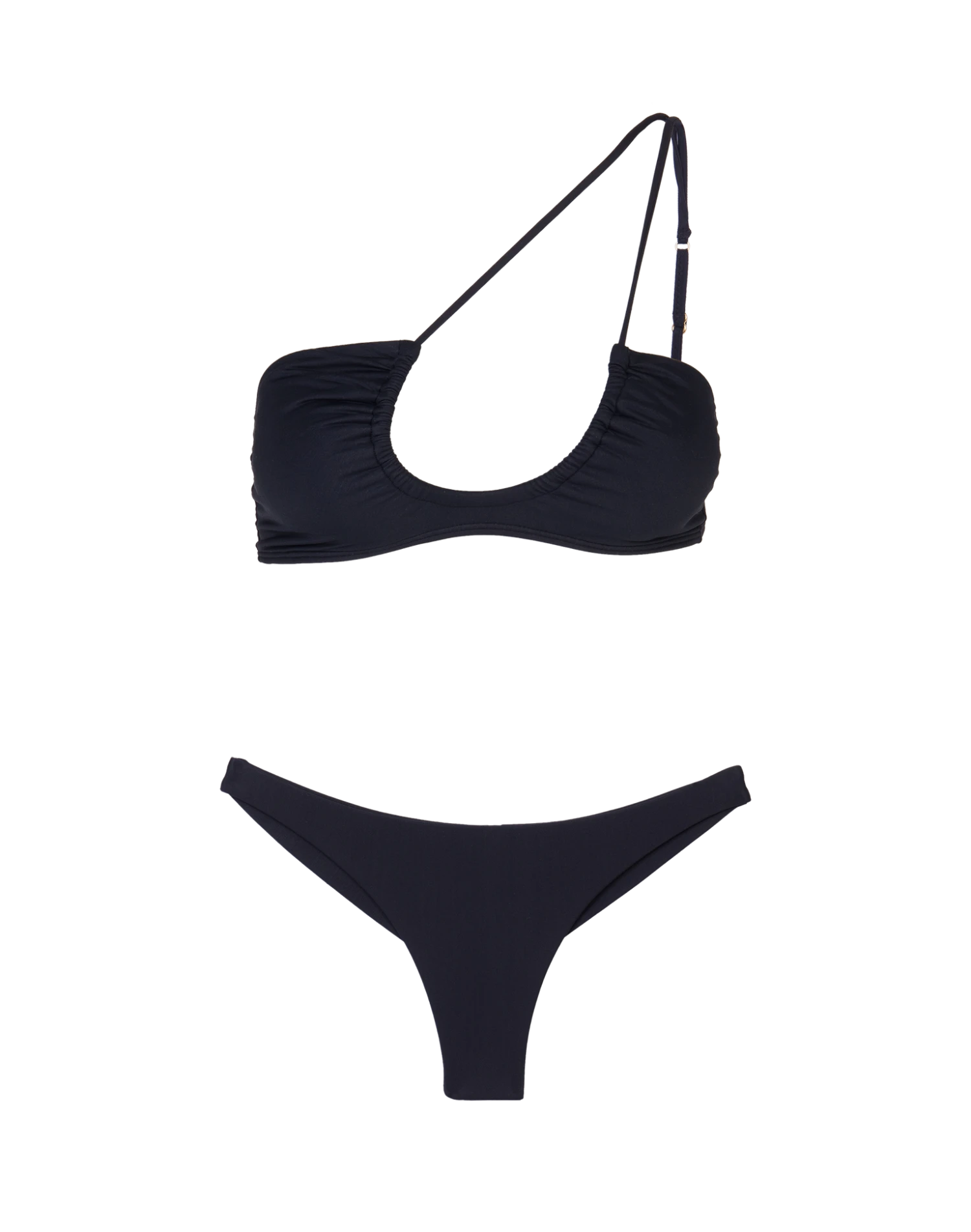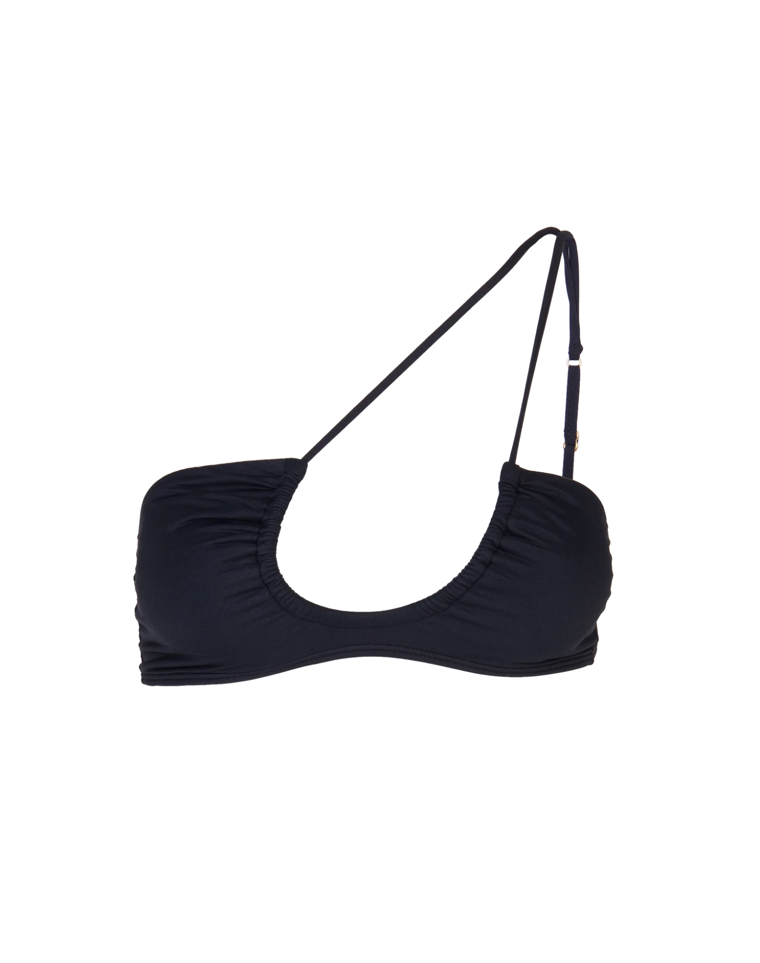 An unique top that will not only give you compliments but also no tan lines. The straps loop to one side and tie in back for a modern cut-out top.