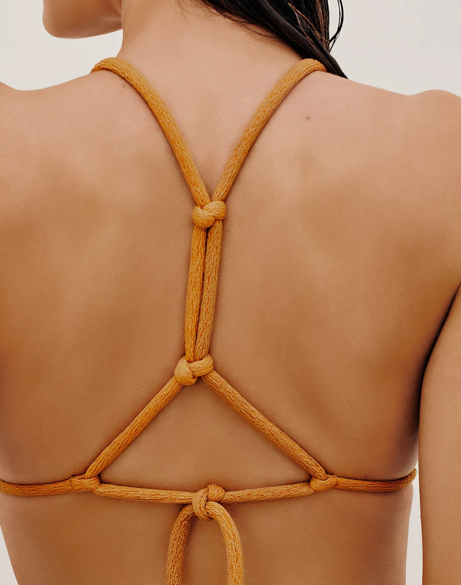 Achieve shoreline glamour in the Edie T Back, a timeless silhouette made for you embrace the heat in the sizzling style. This sunshine stunner is crafted in our exclusive crepe texture fabric, embellished with color contrasrting thick tubular straps that are hand-knitted to elevate your vacation attire.