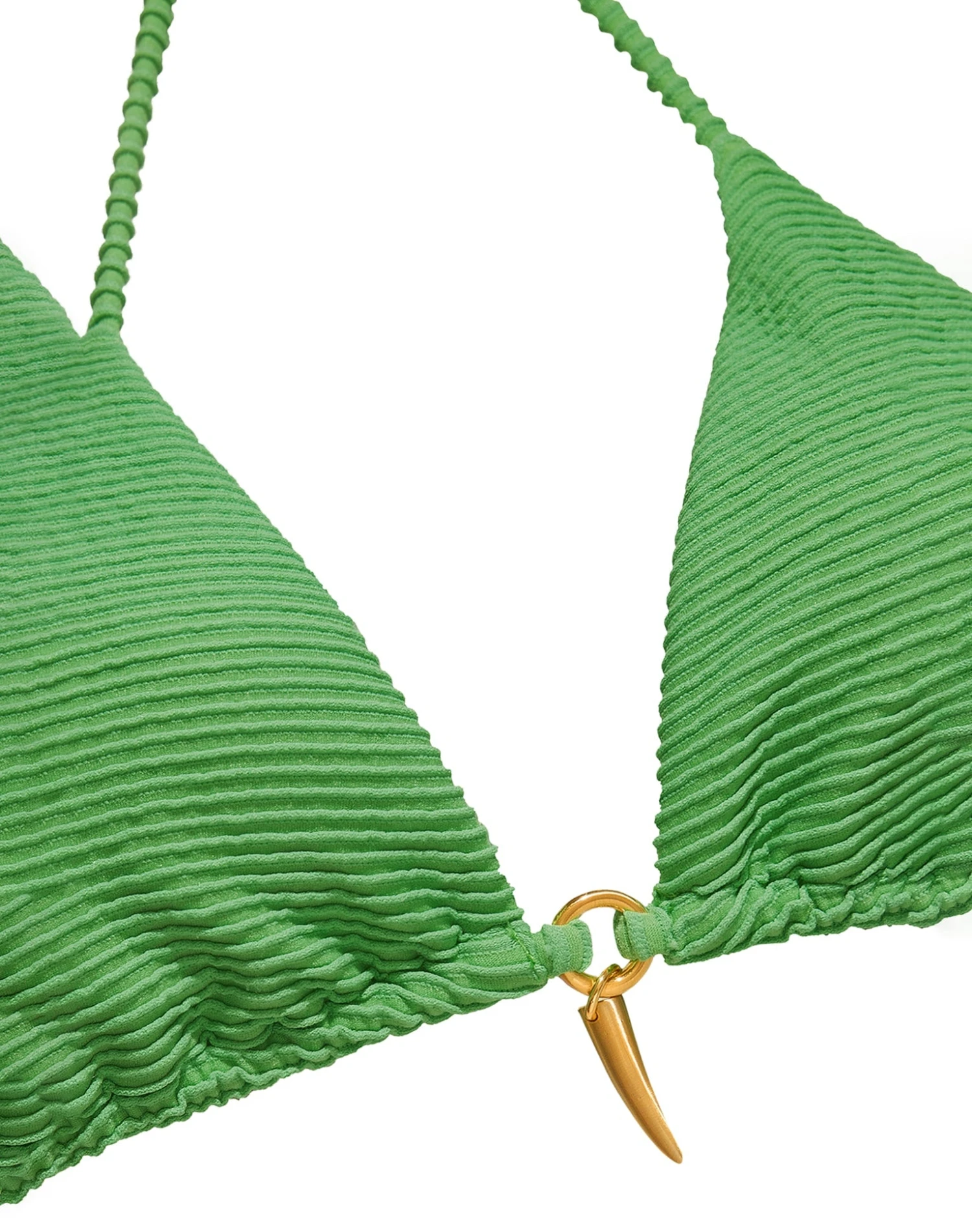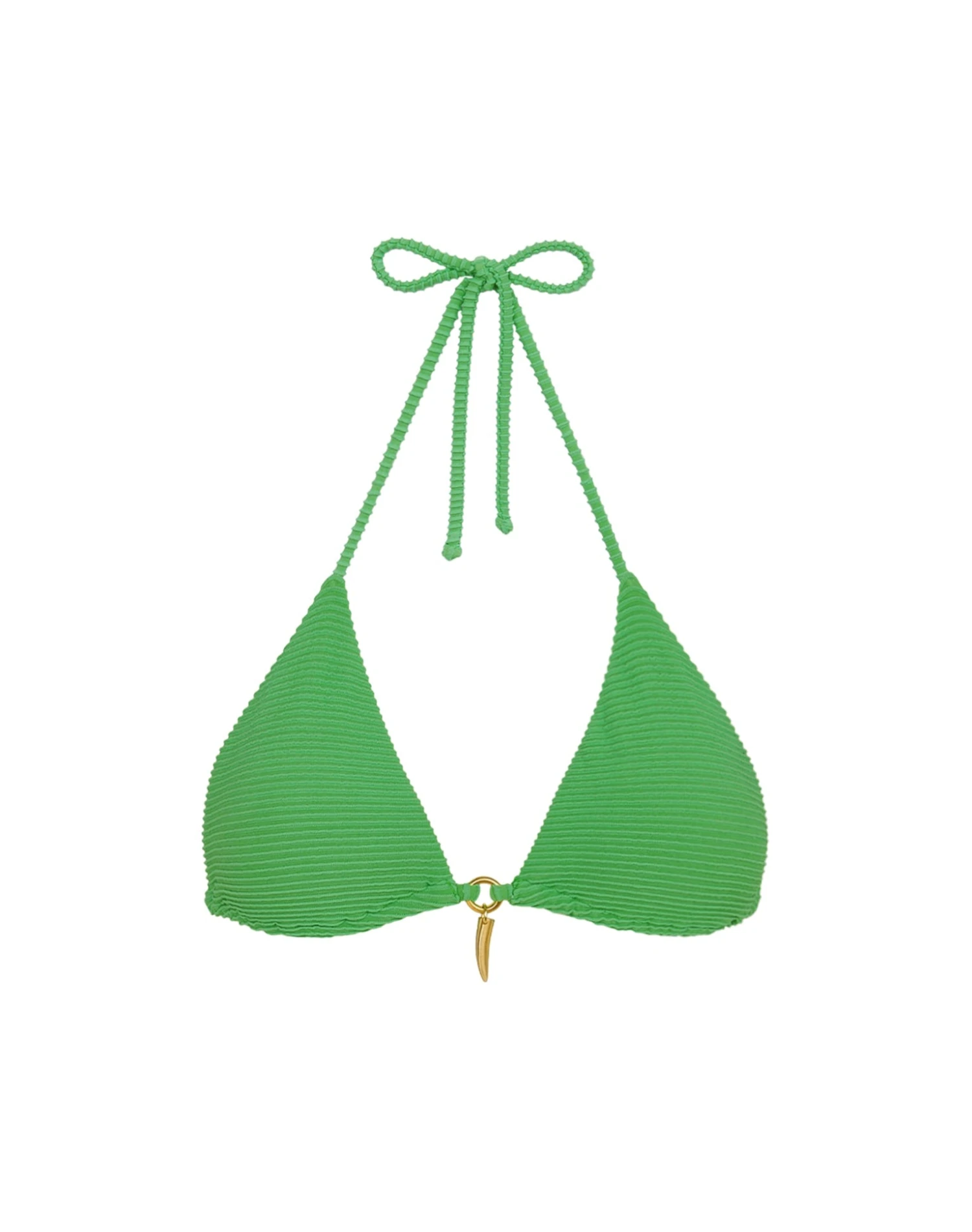 Crafted with our eco-friendly fabric featuring a delicate ribbed feel, this triangle top offers a flattering full-coverage fit. Part of the Diara group, this top includes a 24k glittering gold horn detail at the center and at the tips of the ties to sparkle up your beach day.